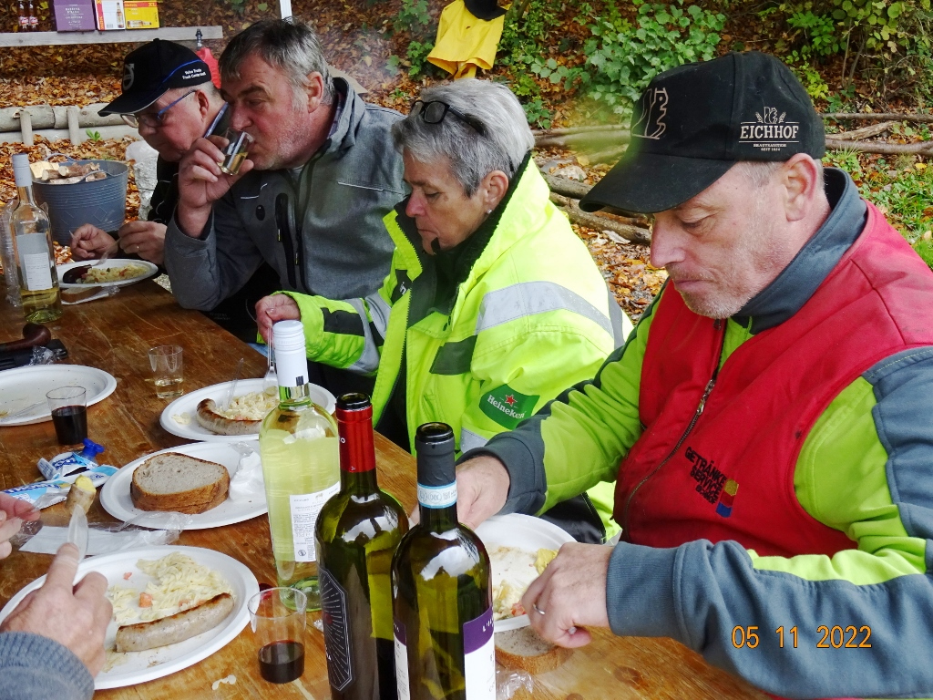 Claire und Daniela waren erst für später «aufgeboten» und für die Verpflegung zuständig. Es gab wie gewohnt «Eingeklemmte» zum Znüni. Zum etwas späteren Mittagessen haben uns die Köchinnen mit Teigwarensalat und Brat- und Feuerwehrwürsten verwöhnt. Chregu sorgte wie gewohnt für die Getränke.
